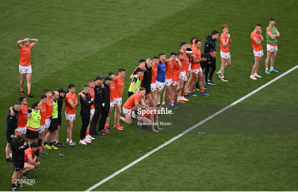 1 July 2023; Armagh players look dejected during the penalty shoot out in the GAA Football All-Ireland Senior Championship quarter-final match between Armagh and Monaghan at Croke Park in Dublin. Photo by Brendan Moran/Sportsfile