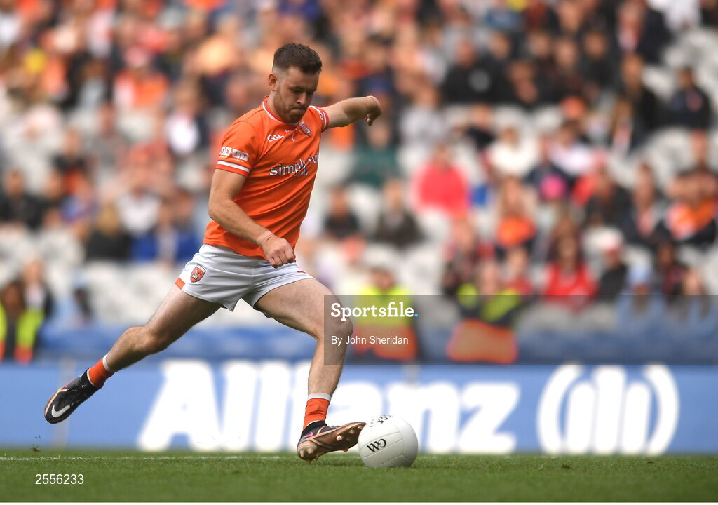 1 July 2023; Callum Cumiskey of Armagh shoots and fails to score during the penalty shoot out in the GAA Football All-Ireland Senior Championship quarter-final match between Armagh and Monaghan at Croke Park in Dublin. Photo by John Sheridan/Sportsfile