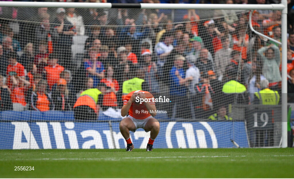 1 July 2023; Callum Cumiskey of Armagh reacts after his last penalty kick was saved during the GAA Football All-Ireland Senior Championship quarter-final match between Armagh and Monaghan at Croke Park in Dublin. Photo by Ray McManus/Sportsfile