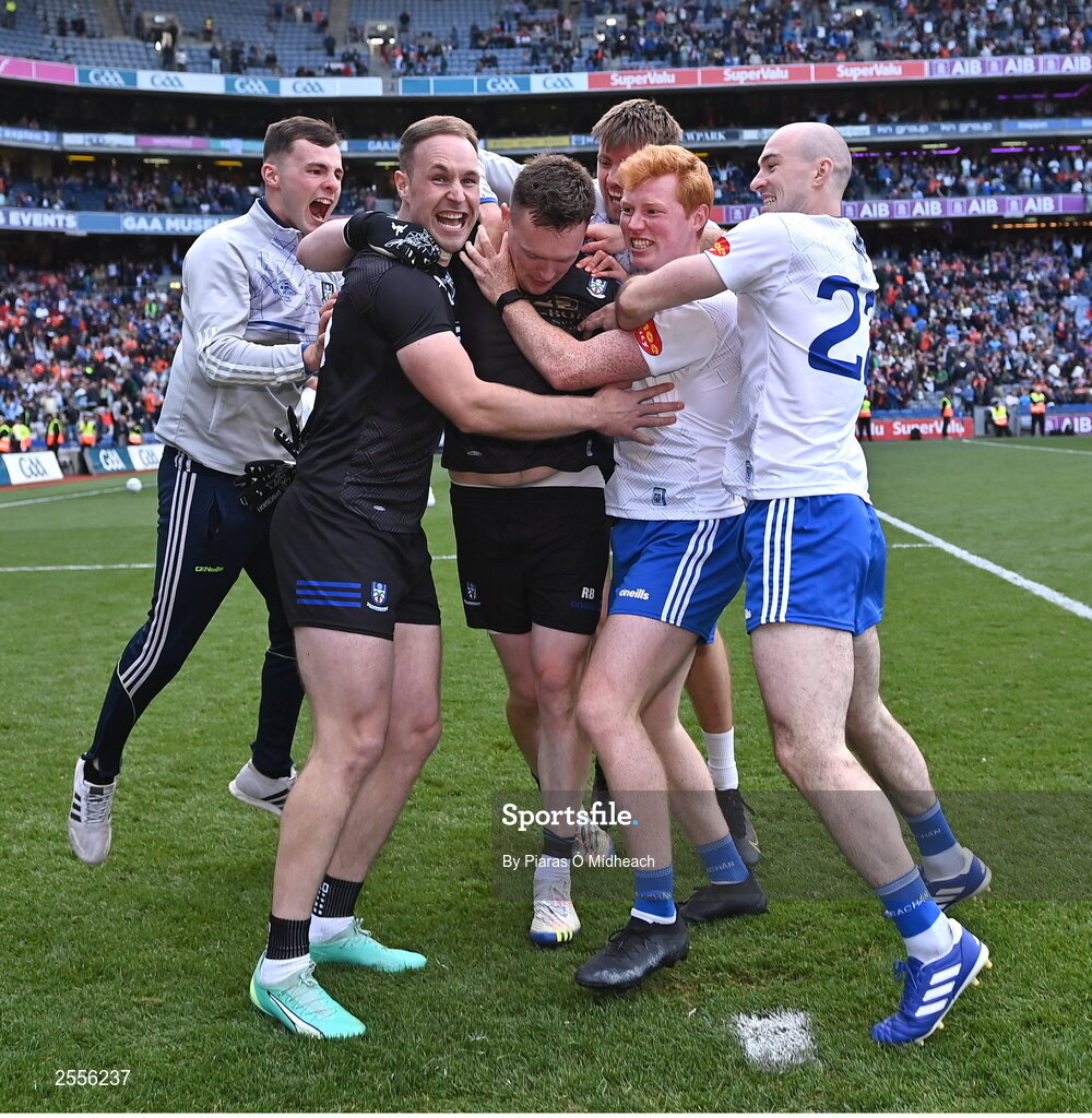 1 July 2023; Monaghan goalkeeper Rory Beggan celebrates with teammates after his side's victory in the penalty shoot-out of the GAA Football All-Ireland Senior Championship quarter-final match between Armagh and Monaghan at Croke Park in Dublin. Photo by Piaras Ó Mídheach/Sportsfile