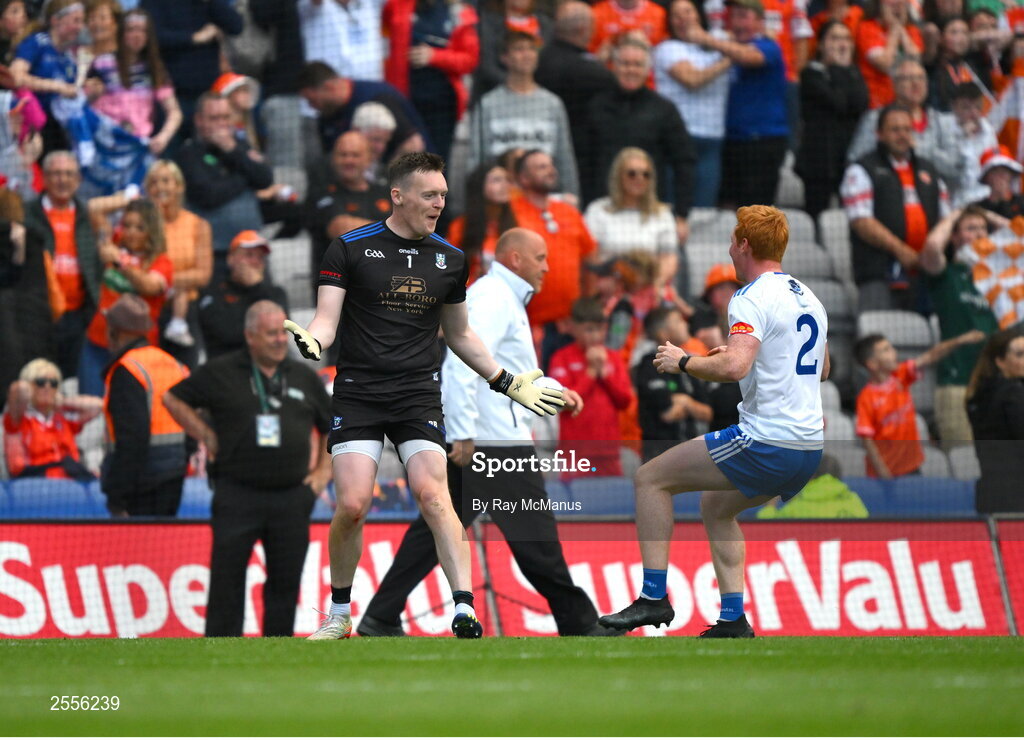 1 July 2023; Monaghan goalkeeper Rory Beggan and Ryan O'Toole celebrate after the GAA Football All-Ireland Senior Championship quarter-final match between Armagh and Monaghan at Croke Park in Dublin. Photo by Ray McManus/Sportsfile