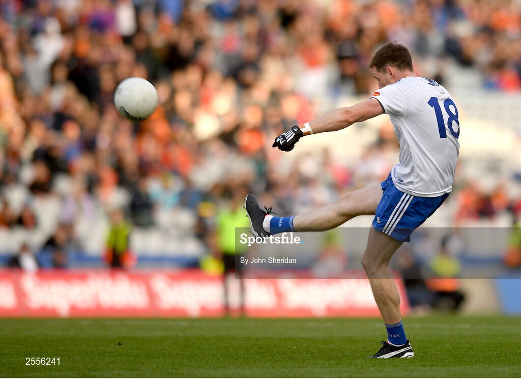 1 July 2023; Conor McManus of Monaghan kicks a free to draw the game in normal time during the GAA Football All-Ireland Senior Championship quarter-final match between Armagh and Monaghan at Croke Park in Dublin. Photo by John Sheridan/Sportsfile