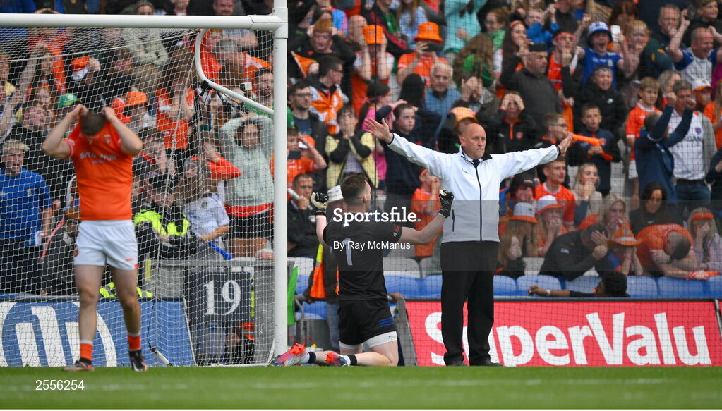 1 July 2023; An umpire signals a wide as Monaghan goalkeeper Rory Beggan celebrates saving the last penalty kick from Callum Cumiskey, left, during the GAA Football All-Ireland Senior Championship quarter-final match between Armagh and Monaghan at Croke Park in Dublin. Photo by Ray McManus/Sportsfile
