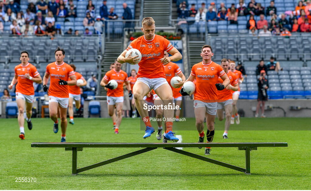 1 July 2023; Rian O'Neill of Armagh jumps the bench on his way to the team photograph before the GAA Football All-Ireland Senior Championship quarter-final match between Armagh and Monaghan at Croke Park in Dublin. Photo by Piaras Ó Mídheach/Sportsfile