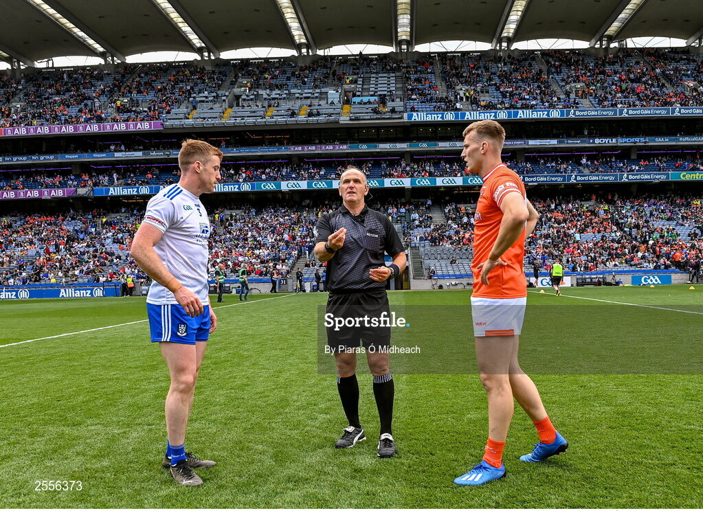 1 July 2023; Referee Conor Lane with team captains Kieran Duffy of Monaghan and Rian O'Neill of Armagh for the coin toss before the GAA Football All-Ireland Senior Championship quarter-final match between Armagh and Monaghan at Croke Park in Dublin. Photo by Piaras Ó Mídheach/Sportsfile