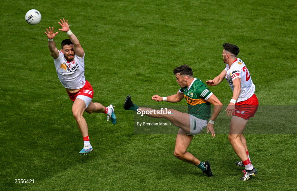 1 July 2023; David Clifford of Kerry kicks a point despite the best efforts of Pádraig Hampsey and Joe Oguz of Tyrone during the GAA Football All-Ireland Senior Championship quarter-final match between Kerry and Tyrone at Croke Park in Dublin. Photo by Brendan Moran/Sportsfile