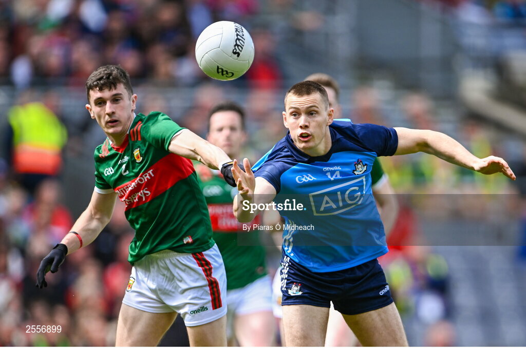 2 July 2023; Con O'Callaghan of Dublin in action against Jack Coyne of Mayo during the GAA Football All-Ireland Senior Championship quarter-final match between Dublin and Mayo at Croke Park in Dublin. Photo by Piaras Ó Mídheach/Sportsfile