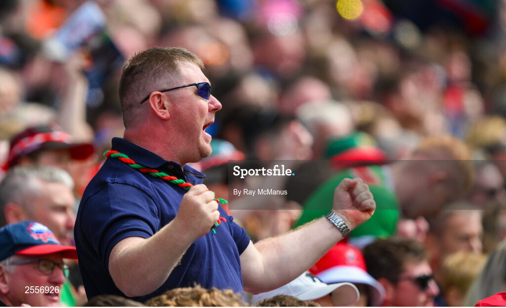 2 July 2023; A Mayo supporter, in the Cusack stand, celebrate a score during the GAA Football All-Ireland Senior Championship quarter-final match between Dublin and Mayo at Croke Park in Dublin. Photo by Ray McManus/Sportsfile