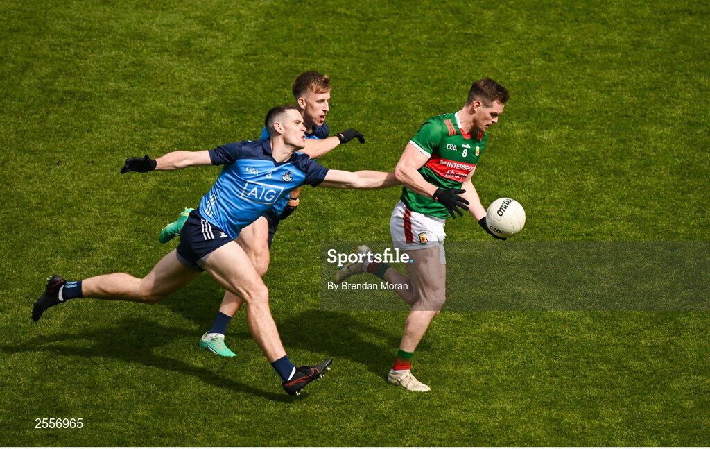 2 July 2023; Matthew Ruane of Mayo gets away from Brian Fenton and Seán Bugler of Dublin during the GAA Football All-Ireland Senior Championship quarter-final match between Dublin and Mayo at Croke Park in Dublin. Photo by Brendan Moran/Sportsfile