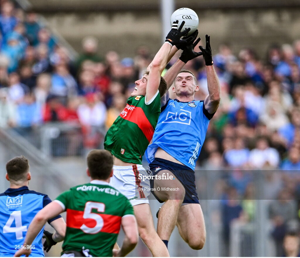 2 July 2023; Brian Fenton of Dublin in action against Eoghan McLaughlin of Mayo during the GAA Football All-Ireland Senior Championship quarter-final match between Dublin and Mayo at Croke Park in Dublin. Photo by Piaras Ó Mídheach/Sportsfile