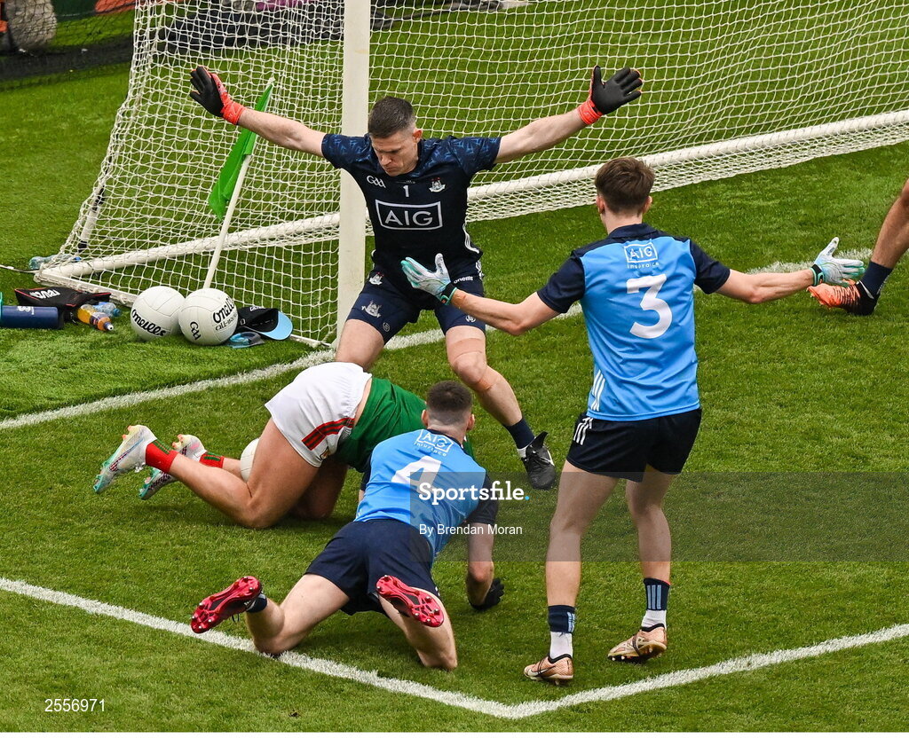 2 July 2023; Jordan Flynn of Mayo gains possession of the ball by lifting it with his knees before scoring a goal which was subsequently disallowed by referee David Gough during the GAA Football All-Ireland Senior Championship quarter-final match between Dublin and Mayo at Croke Park in Dublin. Photo by Brendan Moran/Sportsfile