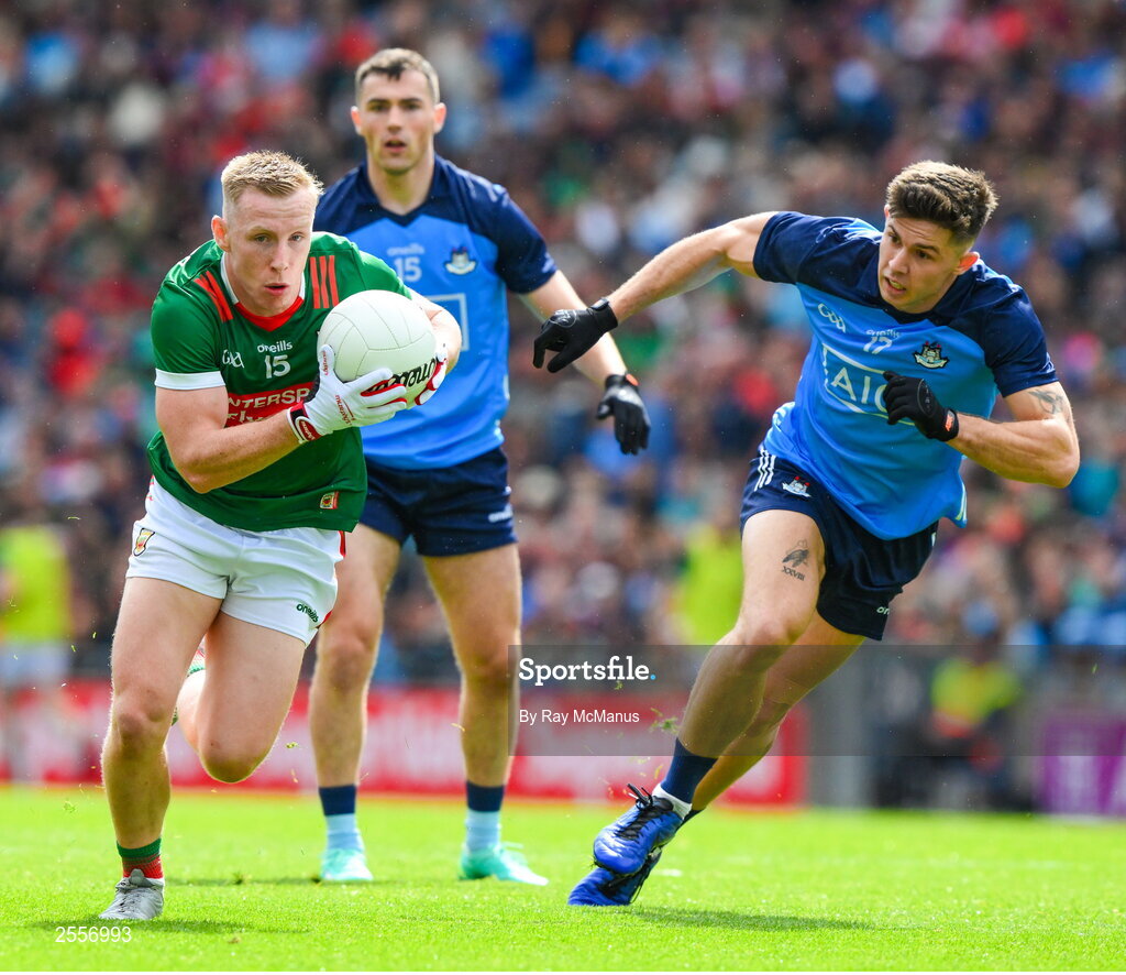 2 July 2023; Ryan O'Donoghue of Mayo in action against David Byrne of Dublin during the GAA Football All-Ireland Senior Championship quarter-final match between Dublin and Mayo at Croke Park in Dublin. Photo by Ray McManus/Sportsfile