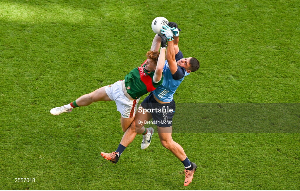 2 July 2023; Jack Carney of Mayo and Brian Howard of Dublin contest a kickout during the GAA Football All-Ireland Senior Championship quarter-final match between Dublin and Mayo at Croke Park in Dublin. Photo by Brendan Moran/Sportsfile