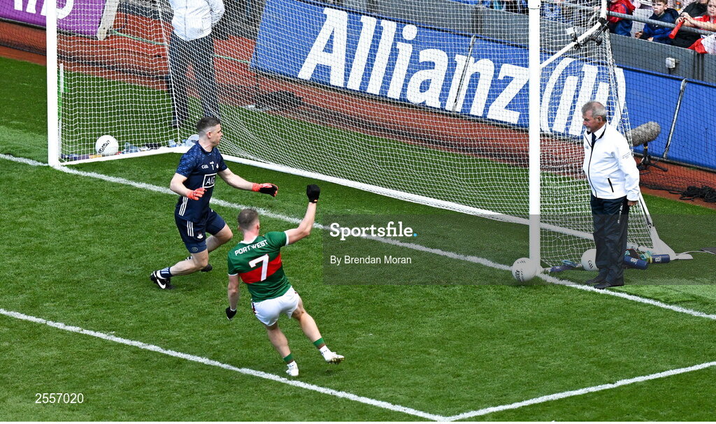 2 July 2023; The ball hits off the post after a shot by Eoghan McLaughlin of Mayo, 7, during the GAA Football All-Ireland Senior Championship quarter-final match between Dublin and Mayo at Croke Park in Dublin. Photo by Brendan Moran/Sportsfile
