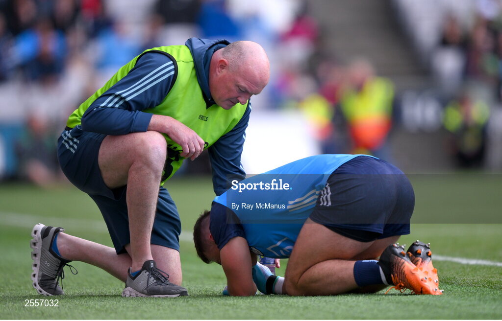 2 July 2023; Dublin 'Maor Uisce' Pat Gilroy attends to Brian Howard of Dublin near the end of the GAA Football All-Ireland Senior Championship quarter-final match between Dublin and Mayo at Croke Park in Dublin. Photo by Ray McManus/Sportsfile
