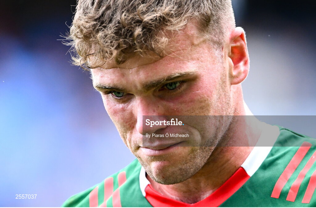 2 July 2023; Jordan Flynn of Mayo after his side's defeat in the GAA Football All-Ireland Senior Championship quarter-final match between Dublin and Mayo at Croke Park in Dublin. Photo by Piaras Ó Mídheach/Sportsfile
