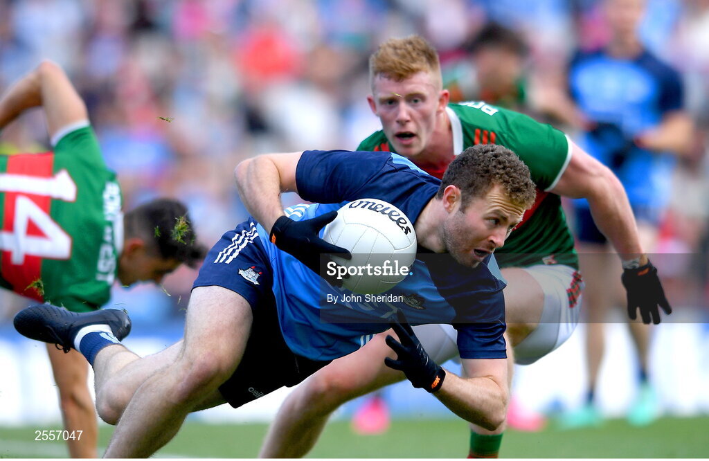 2 July 2023; Jack McCaffrey of Dublin in action against David McBrien of Mayo during the GAA Football All-Ireland Senior Championship quarter-final match between Dublin and Mayo at Croke Park in Dublin. Photo by John Sheridan/Sportsfile