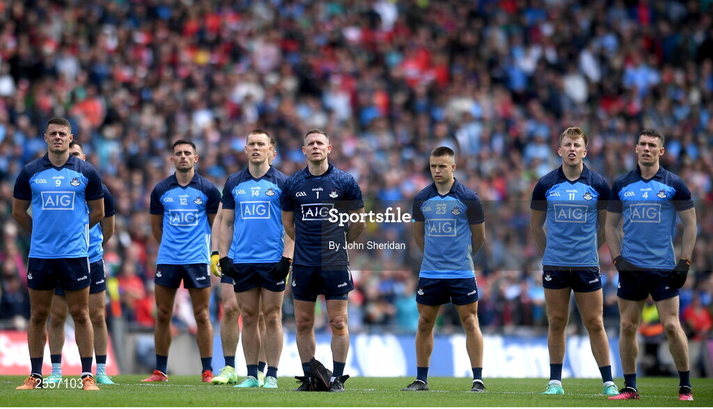 2 July 2023; Dublin players, from left, Brian Howard, Niall Scully, Con O'Callaghan, Stephen Cluxton, Eoin Murchan, Seán Bugler and Lee Gannon during the National Anthem before the GAA Football All-Ireland Senior Championship quarter-final match between Dublin and Mayo at Croke Park in Dublin. Photo by John Sheridan/Sportsfile