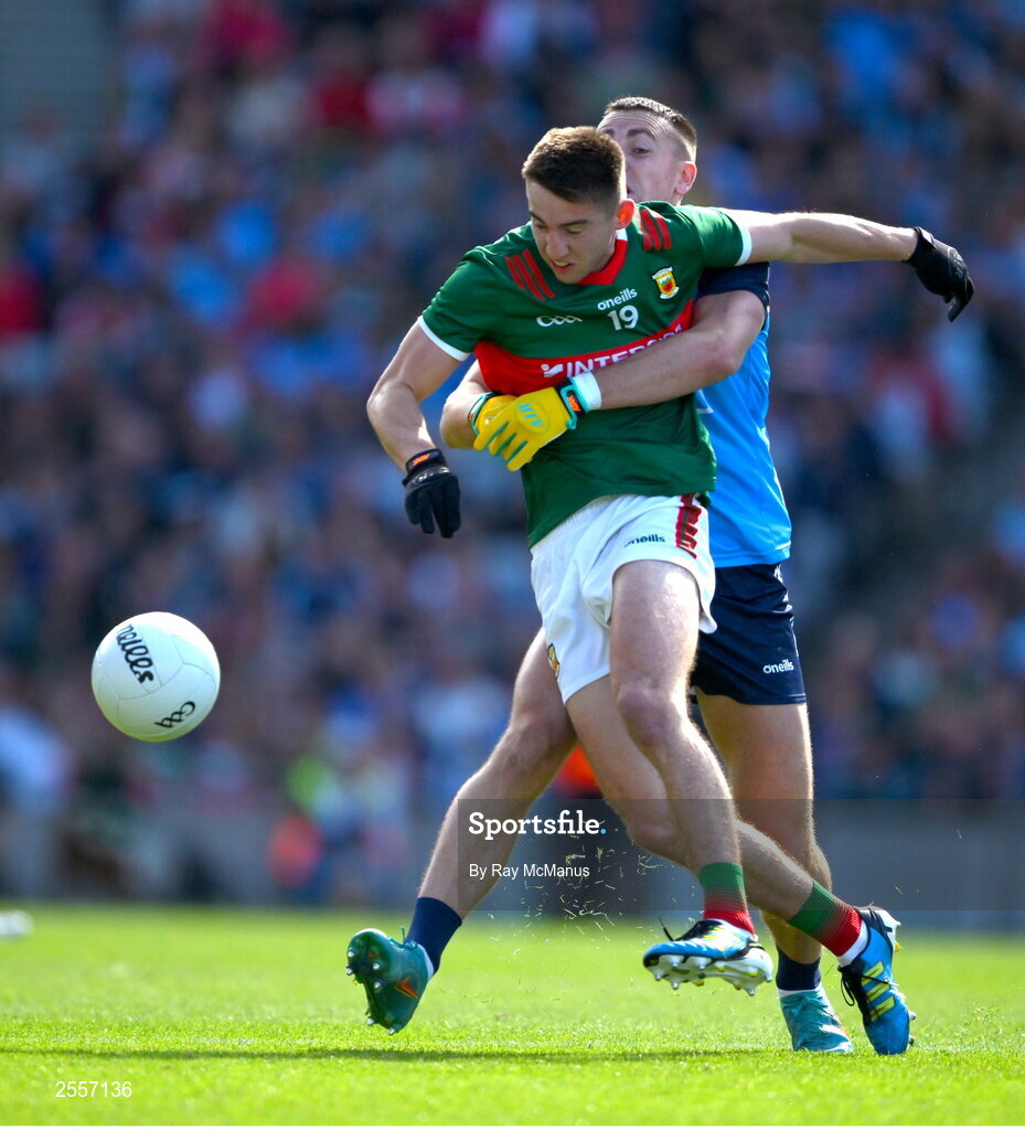 2 July 2023; Enda Hession of Mayo is tackled by Cormac Costello of Dublin during the GAA Football All-Ireland Senior Championship quarter-final match between Dublin and Mayo at Croke Park in Dublin. Photo by Ray McManus/Sportsfile