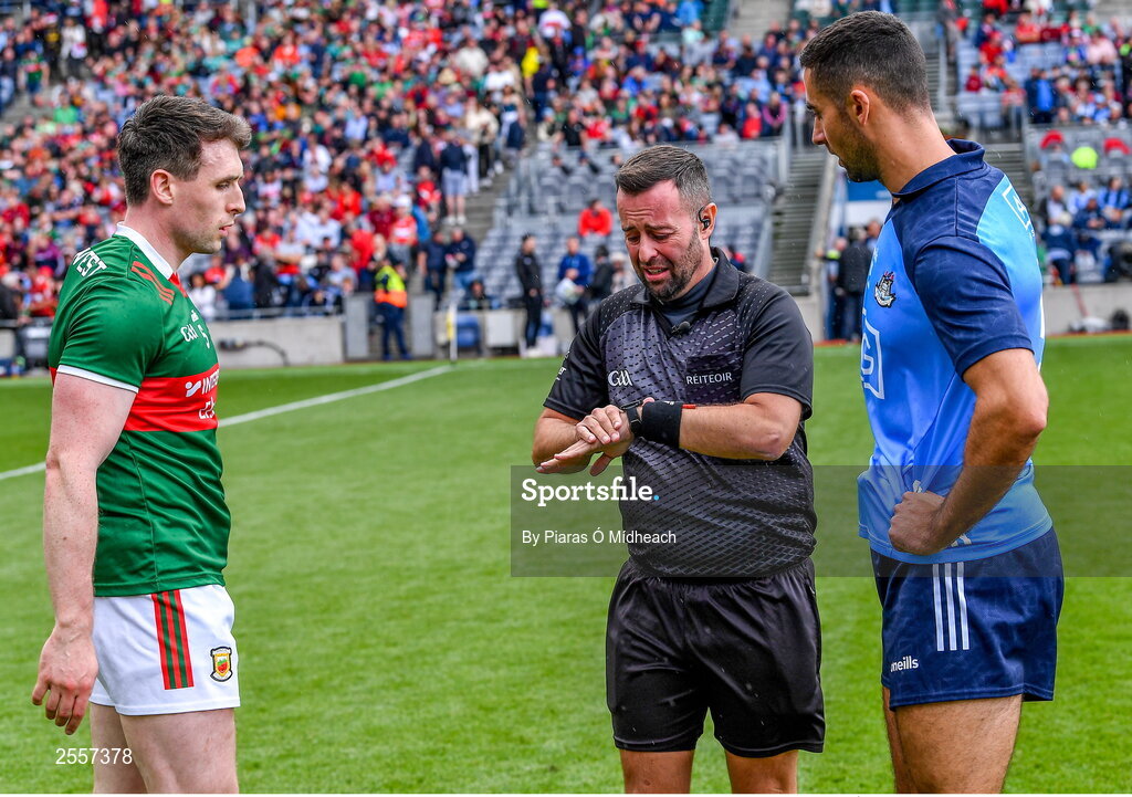 2 July 2023; Referee David Gough with team captains Paddy Durcan of Mayo and James McCarthy of Dublin for the coin toss before the GAA Football All-Ireland Senior Championship quarter-final match between Dublin and Mayo at Croke Park in Dublin. Photo by Piaras Ó Mídheach/Sportsfile