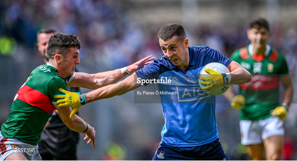 2 July 2023; Cormac Costello of Dublin in action against Jack Coyne of Mayo during the GAA Football All-Ireland Senior Championship quarter-final match between Dublin and Mayo at Croke Park in Dublin. Photo by Piaras Ó Mídheach/Sportsfile