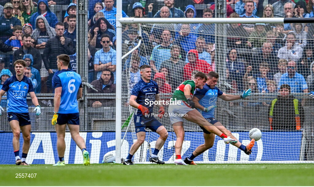2 July 2023; Jordan Flynn of Mayo shoots to score a goal that wasn't allowed during the GAA Football All-Ireland Senior Championship quarter-final match between Dublin and Mayo at Croke Park in Dublin. Photo by Piaras Ó Mídheach/Sportsfile