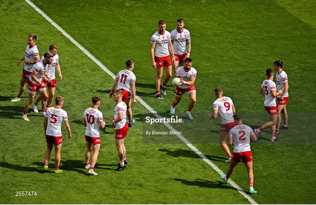 1 July 2023; The Tyrone team warm up before the GAA Football All-Ireland Senior Championship quarter-final match between Kerry and Tyrone at Croke Park in Dublin. Photo by Brendan Moran/Sportsfile