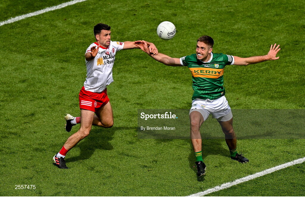 1 July 2023; Adrian Spillane of Kerry and Darren McCurry of Tyrone tussle for possession during the GAA Football All-Ireland Senior Championship quarter-final match between Kerry and Tyrone at Croke Park in Dublin. Photo by Brendan Moran/Sportsfile