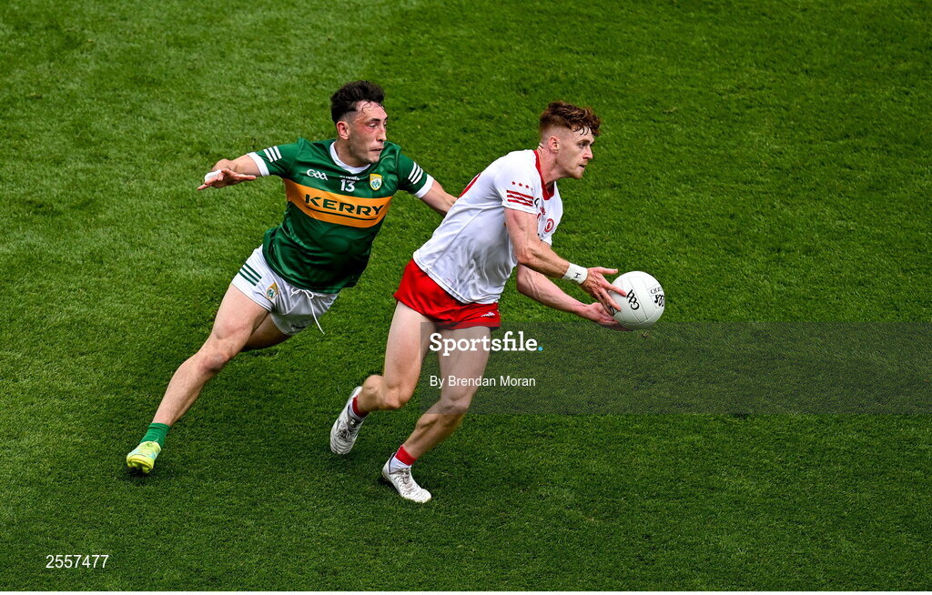 1 July 2023; Conor Meyler of Tyrone in action against Paudie Clifford of Kerry during the GAA Football All-Ireland Senior Championship quarter-final match between Kerry and Tyrone at Croke Park in Dublin. Photo by Brendan Moran/Sportsfile