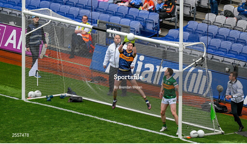 1 July 2023; Kerry goalkeeper Shane Ryan makes a save during the GAA Football All-Ireland Senior Championship quarter-final match between Kerry and Tyrone at Croke Park in Dublin. Photo by Brendan Moran/Sportsfile