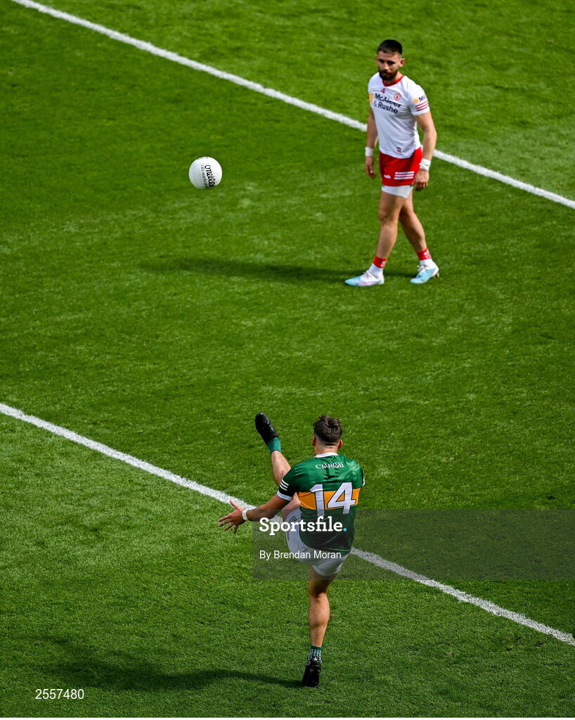 1 July 2023; David Clifford of Kerry scores a free kick as Pádraig Hampsey of Tyrone looks on during the GAA Football All-Ireland Senior Championship quarter-final match between Kerry and Tyrone at Croke Park in Dublin. Photo by Brendan Moran/Sportsfile