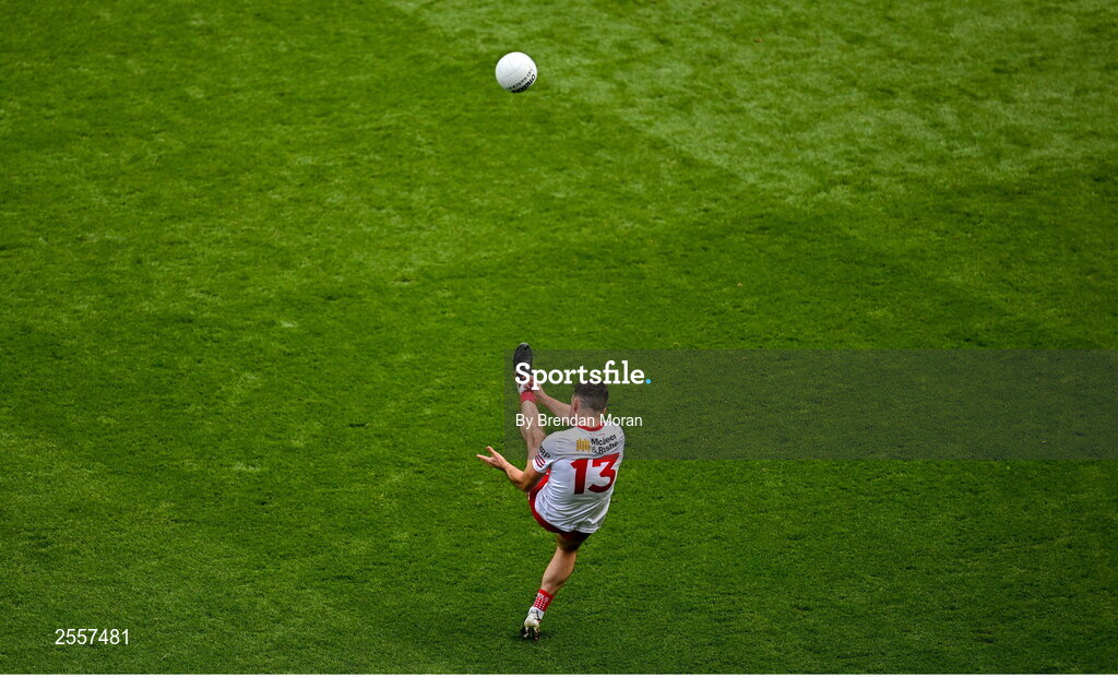 1 July 2023; Darren McCurry of Tyrone scores a free kick during the GAA Football All-Ireland Senior Championship quarter-final match between Kerry and Tyrone at Croke Park in Dublin. Photo by Brendan Moran/Sportsfile