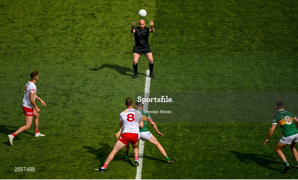 1 July 2023; Referee Brendan Cawley throws the ball in to start the GAA Football All-Ireland Senior Championship quarter-final match between Kerry and Tyrone at Croke Park in Dublin. Photo by Brendan Moran/Sportsfile