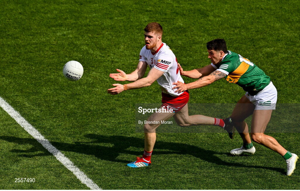 1 July 2023; Cathal McShane of Tyrone in action against Tony Brosnan of Kerry during the GAA Football All-Ireland Senior Championship quarter-final match between Kerry and Tyrone at Croke Park in Dublin. Photo by Brendan Moran/Sportsfile