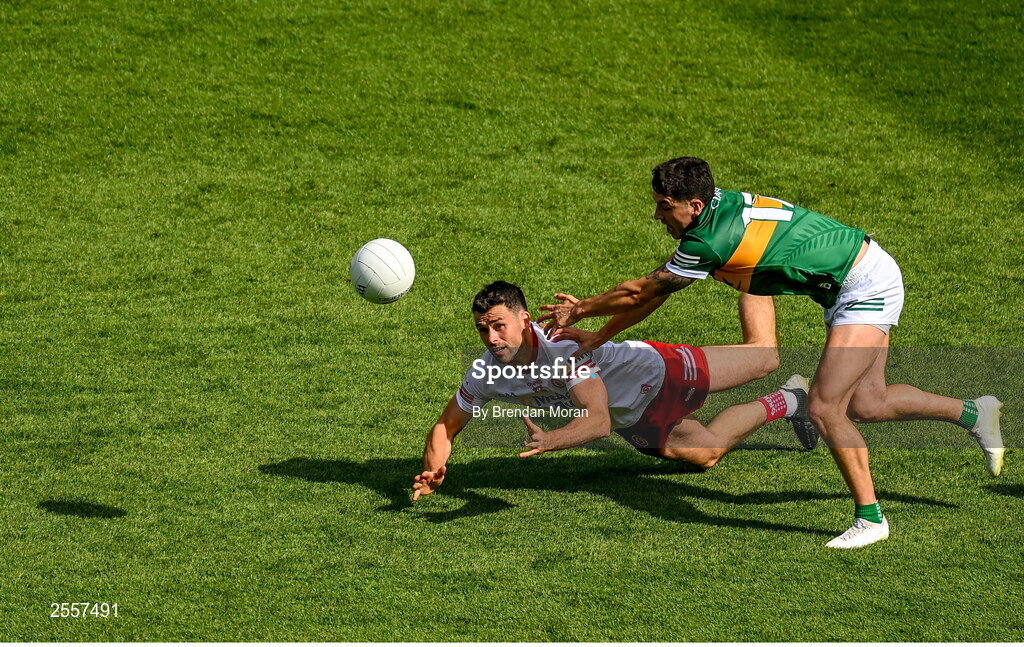 1 July 2023; Darren McCurry of Tyrone in action against Tony Brosnan of Kerry during the GAA Football All-Ireland Senior Championship quarter-final match between Kerry and Tyrone at Croke Park in Dublin. Photo by Brendan Moran/Sportsfile