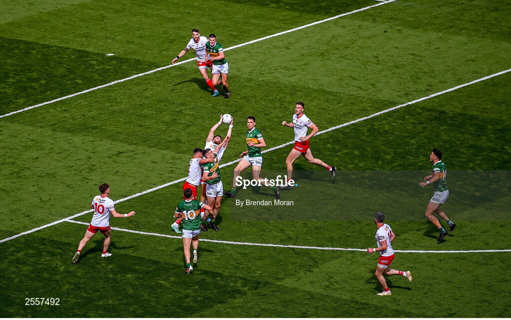 1 July 2023; Pádraig Hampsey of Tyrone catches a high ball during the GAA Football All-Ireland Senior Championship quarter-final match between Kerry and Tyrone at Croke Park in Dublin. Photo by Brendan Moran/Sportsfile