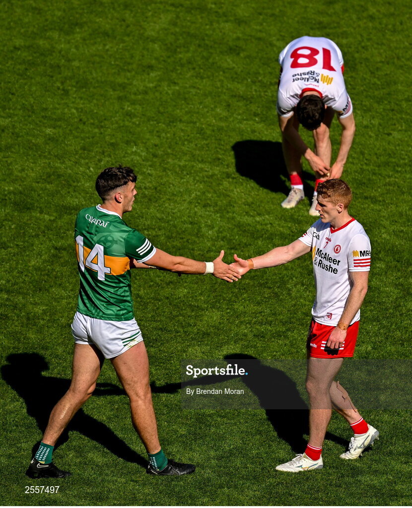 1 July 2023; David Clifford of Kerry shakes hands with Peter Harte of Tyrone after the GAA Football All-Ireland Senior Championship quarter-final match between Kerry and Tyrone at Croke Park in Dublin. Photo by Brendan Moran/Sportsfile