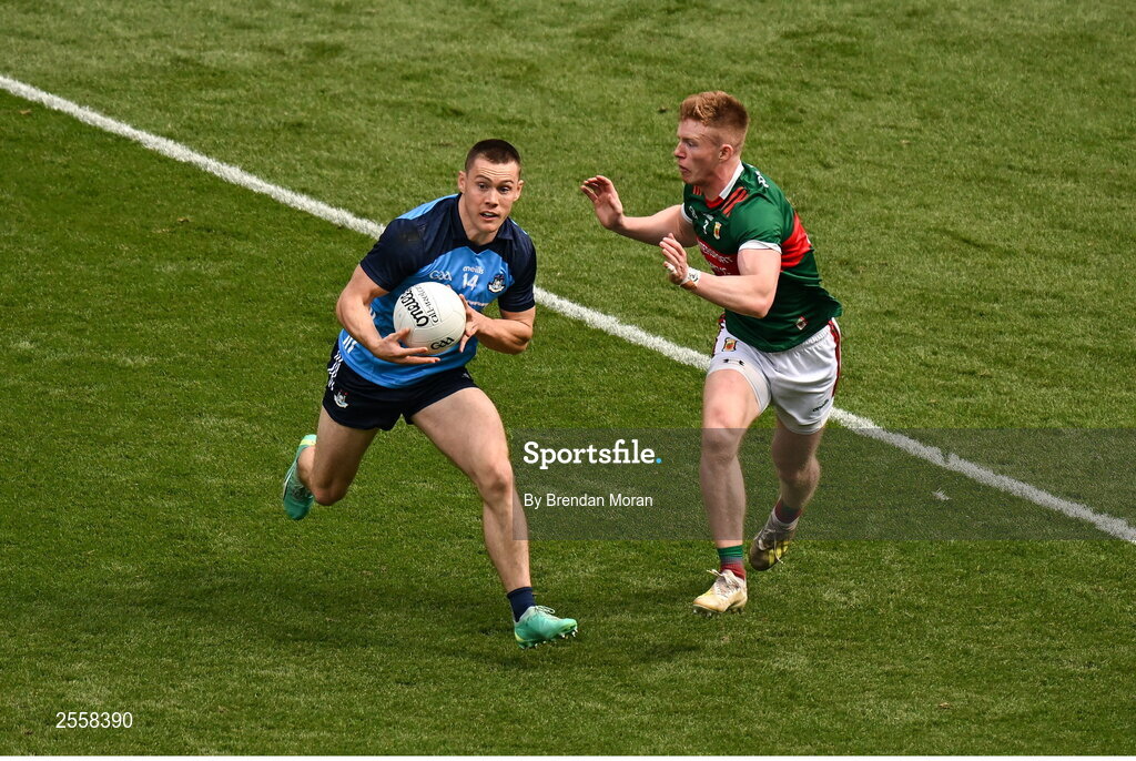 2 July 2023; Con O'Callaghan of Dublin in action against David McBrien of Mayo during the GAA Football All-Ireland Senior Championship quarter-final match between Dublin and Mayo at Croke Park in Dublin. Photo by Brendan Moran/Sportsfile