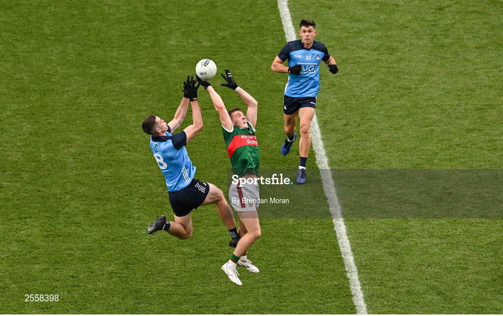 2 July 2023; Brian Fenton of Dublin and Eoghan McLaughlin of Mayo contest a kickout during the GAA Football All-Ireland Senior Championship quarter-final match between Dublin and Mayo at Croke Park in Dublin. Photo by Brendan Moran/Sportsfile