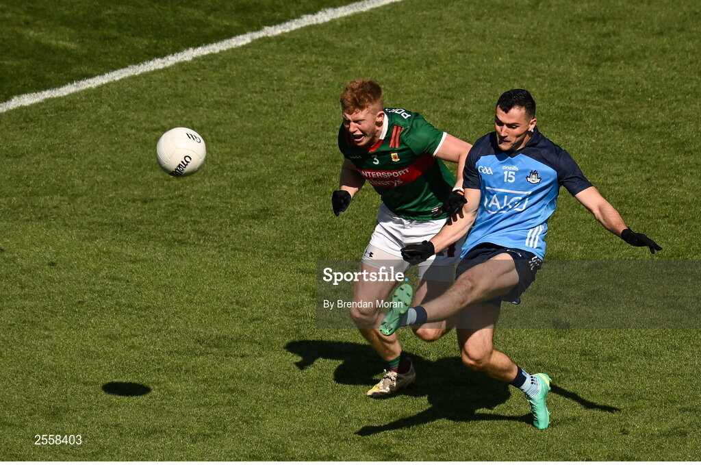 2 July 2023; Colm Basquel of Dublin in action against David McBrien of Mayo during the GAA Football All-Ireland Senior Championship quarter-final match between Dublin and Mayo at Croke Park in Dublin. Photo by Brendan Moran/Sportsfile