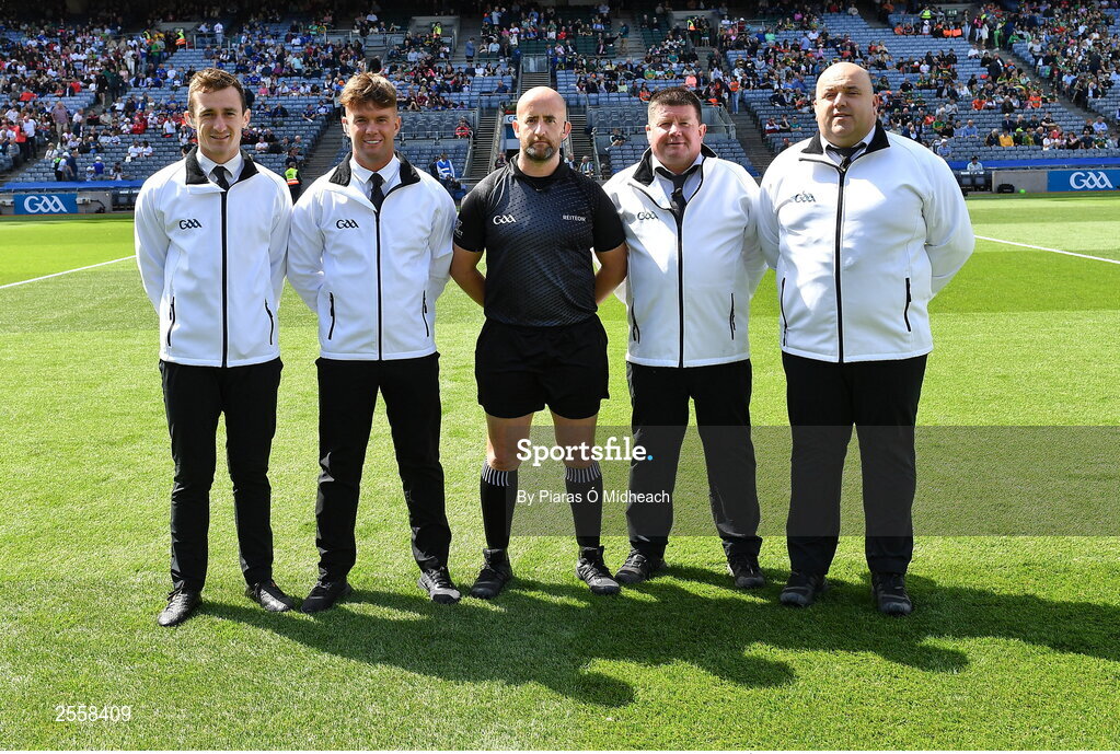 1 July 2023; Referee Brendan Cawley with his match officials before the GAA Football All-Ireland Senior Championship quarter-final match between Kerry and Tyrone at Croke Park in Dublin. Photo by Piaras Ó Mídheach/Sportsfile