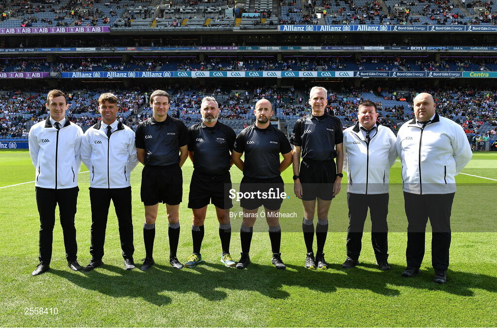 1 July 2023; Referee Brendan Cawley with his match officials before the GAA Football All-Ireland Senior Championship quarter-final match between Kerry and Tyrone at Croke Park in Dublin. Photo by Piaras Ó Mídheach/Sportsfile