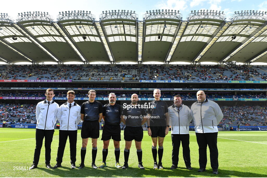 1 July 2023; Referee Brendan Cawley with his match officials before the GAA Football All-Ireland Senior Championship quarter-final match between Kerry and Tyrone at Croke Park in Dublin. Photo by Piaras Ó Mídheach/Sportsfile