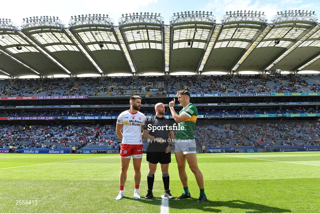 1 July 2023; Referee Brendan Cawley with team captains Pádraig Hampsey of Tyrone and David Clifford of Kerry before the GAA Football All-Ireland Senior Championship quarter-final match between Kerry and Tyrone at Croke Park in Dublin. Photo by Piaras Ó Mídheach/Sportsfile