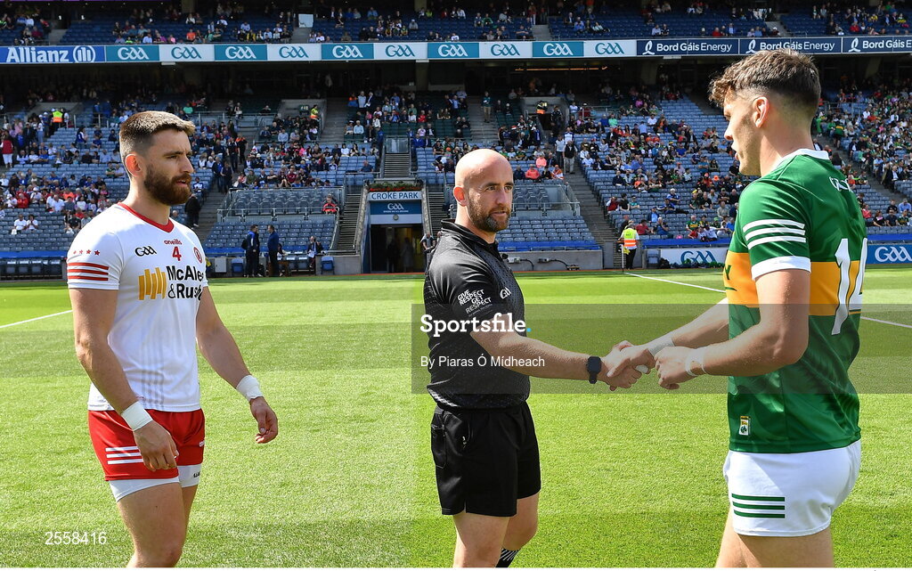 1 July 2023; Referee Brendan Cawley with team captains Pádraig Hampsey of Tyrone and David Clifford of Kerry before the GAA Football All-Ireland Senior Championship quarter-final match between Kerry and Tyrone at Croke Park in Dublin. Photo by Piaras Ó Mídheach/Sportsfile