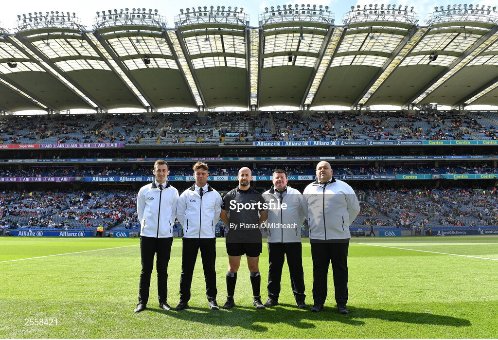 1 July 2023; Referee Brendan Cawley with his match officials before the GAA Football All-Ireland Senior Championship quarter-final match between Kerry and Tyrone at Croke Park in Dublin. Photo by Piaras Ó Mídheach/Sportsfile