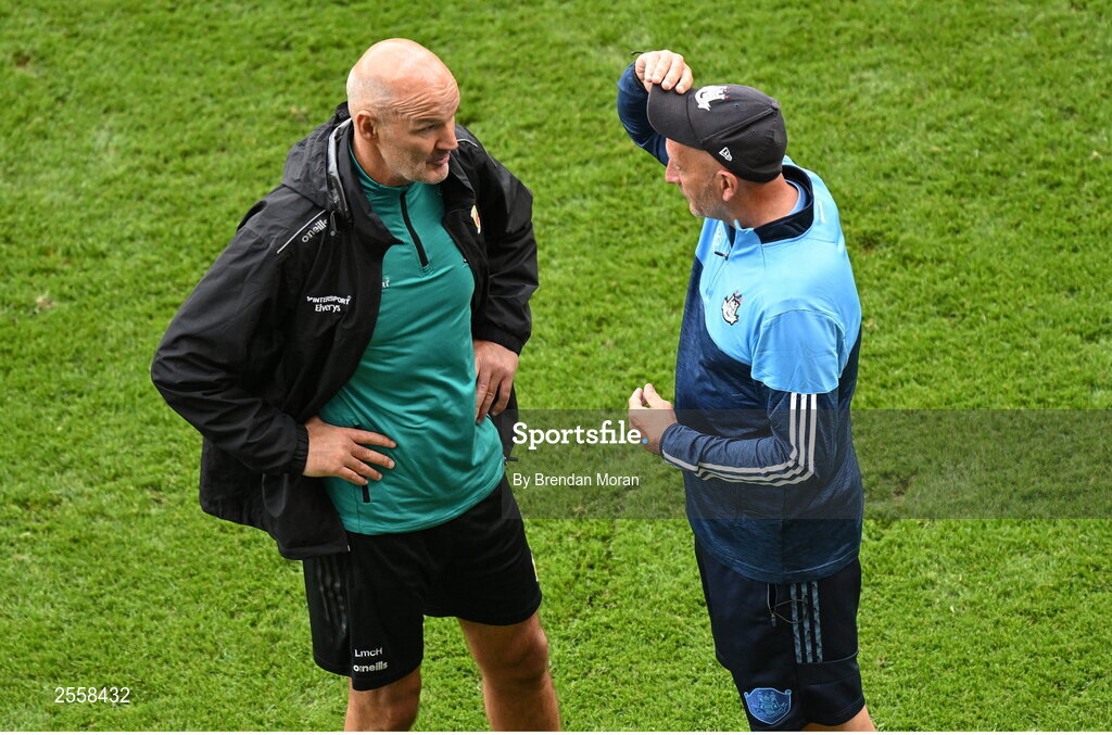 2 July 2023; Mayo selector Liam McHale, left, and Dublin selector Mick Galvin in conversation after the GAA Football All-Ireland Senior Championship quarter-final match between Dublin and Mayo at Croke Park in Dublin. Photo by Brendan Moran/Sportsfile