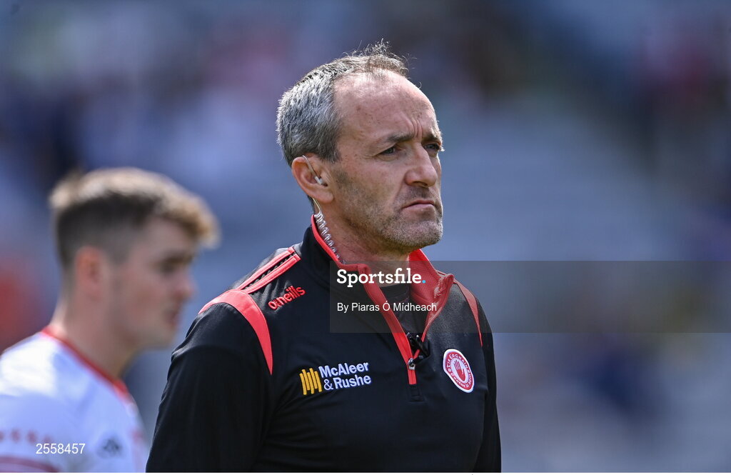 1 July 2023; Tyrone joint-manager Brian Dooher before the GAA Football All-Ireland Senior Championship quarter-final match between Kerry and Tyrone at Croke Park in Dublin. Photo by Piaras Ó Mídheach/Sportsfile