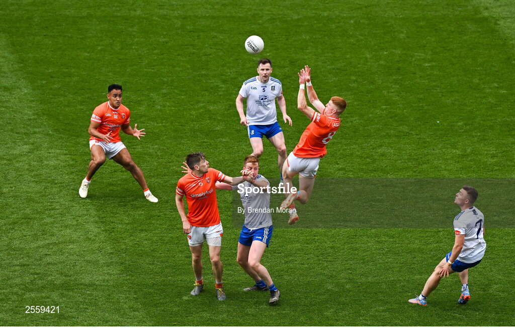1 July 2023; Ciaran Mackin of Armagh goes high to claim possession from a kick out during the GAA Football All-Ireland Senior Championship quarter-final match between Armagh and Monaghan at Croke Park in Dublin. Photo by Brendan Moran/Sportsfile