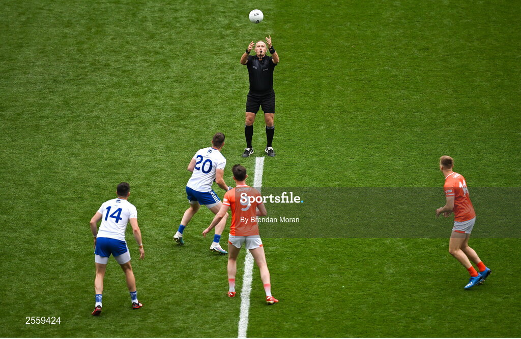 1 July 2023; Referee Conor Lane throws the ball in to start the GAA Football All-Ireland Senior Championship quarter-final match between Armagh and Monaghan at Croke Park in Dublin. Photo by Brendan Moran/Sportsfile